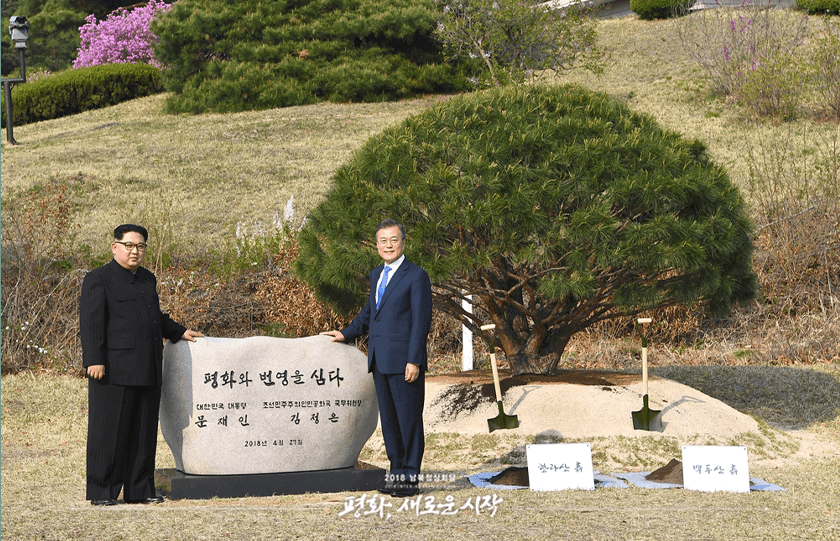 2018년 4월 27일, 문재인 대통령과 김정은 위원장의 소나무 공동 식수(출처 : 대통령기록관)